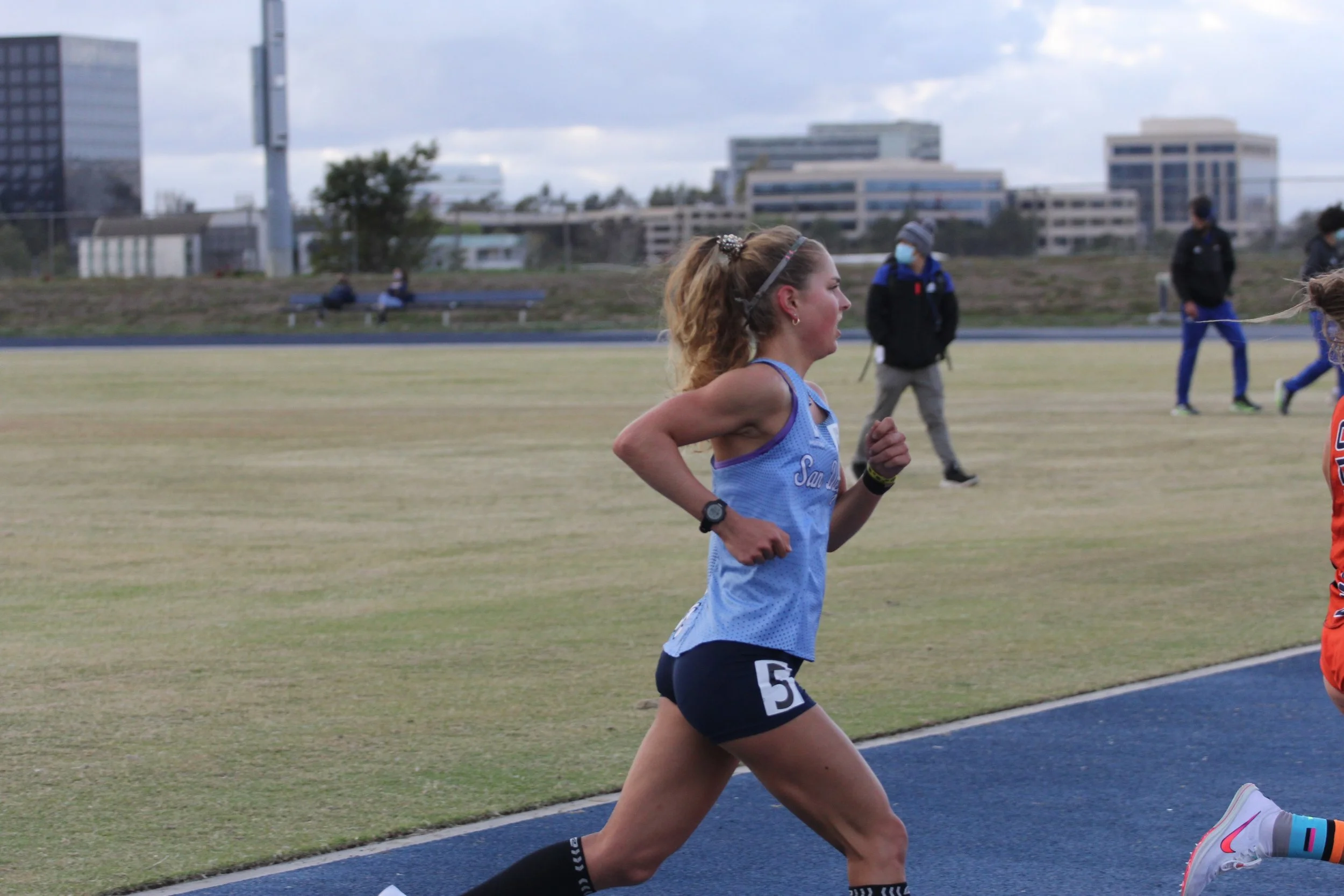 These aspirations were shut down once again after USD declared all fall sports to be unable to compete and train as a team throughout the semester. Regardless, she continued to train alone and set goals, even when it seemed like the next opportunity to compete was years away. At the end of what would have been her XC season, she did another 5K at race effort, this time with USD’s Coach Guarino on a bike alongside. To her complete surprise, she hit another personal record, this time by another 45 seconds to hit 17:01 for the 3.1 miles. Fortunately, she earned the chance to race in early 2021 and reflect her year of training in a race setting.